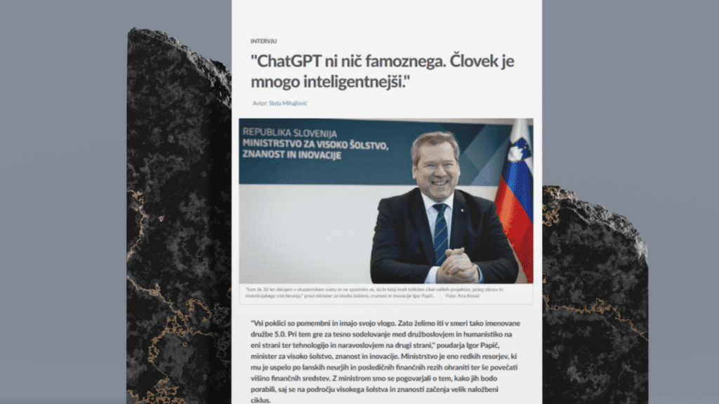 »Sem zagovornik družbe 5.0, ki pomeni ravnovesje delovanja vseh. Jaz kot tehnik lahko razvijam stroj, humanist bo razmišljal, kaj to lahko povzroči človeku, družboslovec pa o tem, kako bomo to uporabljali v družbi. Vsi poklici so pomembni in imajo svojo vlogo,« je v intervjuju za spletni portal Siol povedal minister za visoko šolstvo, znanost in inovacije dr. Igor Papič.