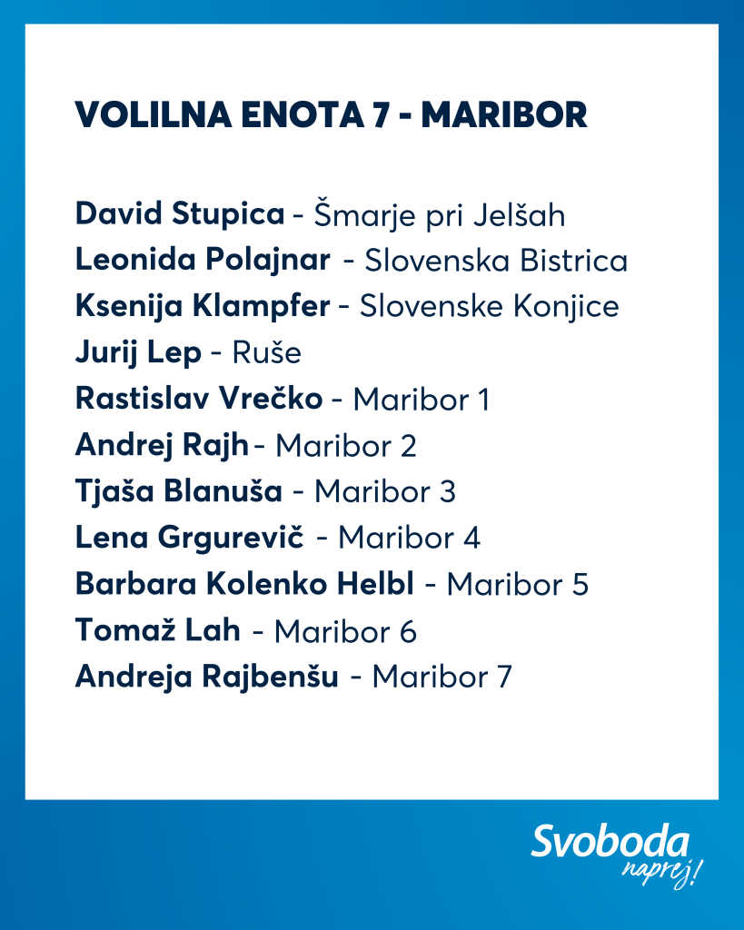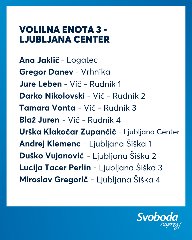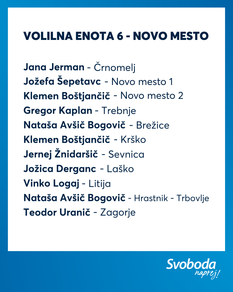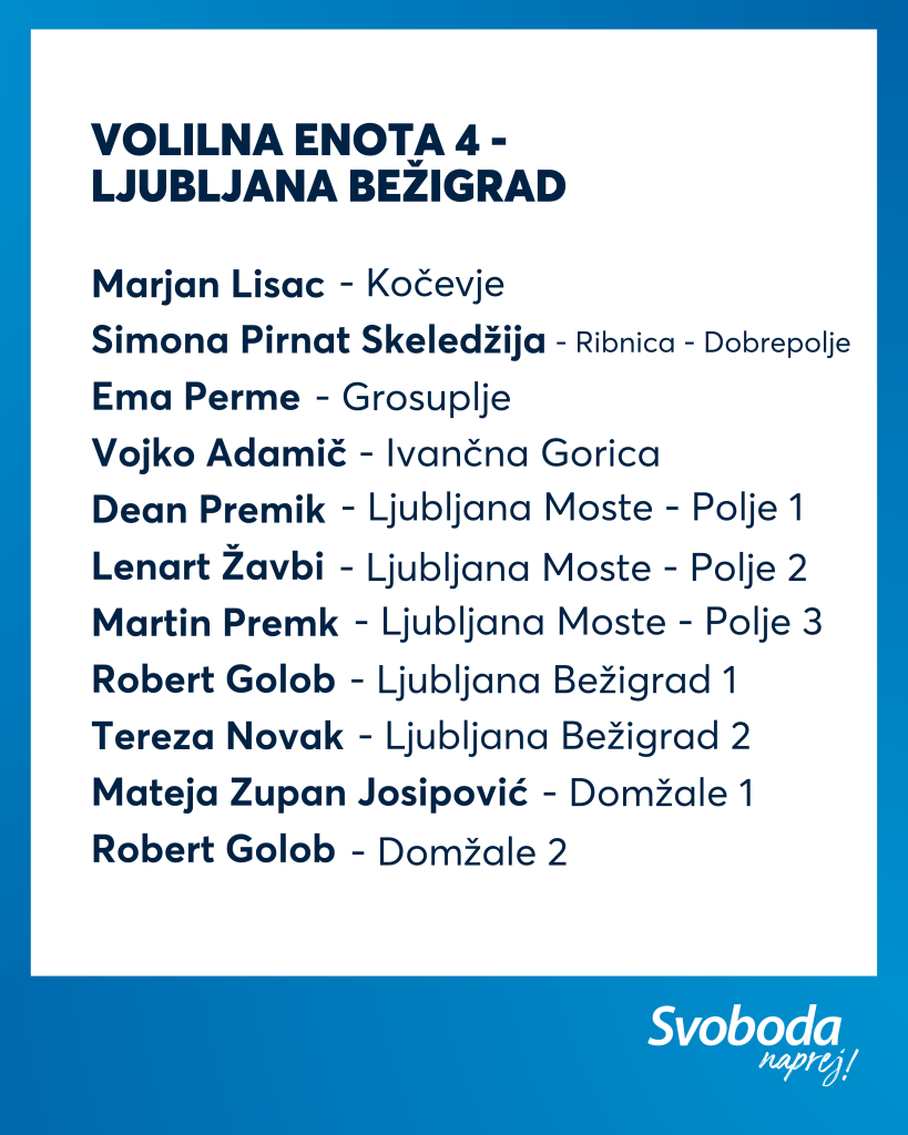 Ekipa Svobode je izkušena, na njej najdemo večino naših aktualnih ministrov ter poslank in poslancev, hkrati pa je kar 11 % kandidatk in kandidatov na naši listi mlajših od 35 let. Tako lahko zagotovimo kontinuiteto, stabilnost in odgovorno vodenje, hkrati pa tudi sveže ideje, ki jih Slovenija potrebuje.