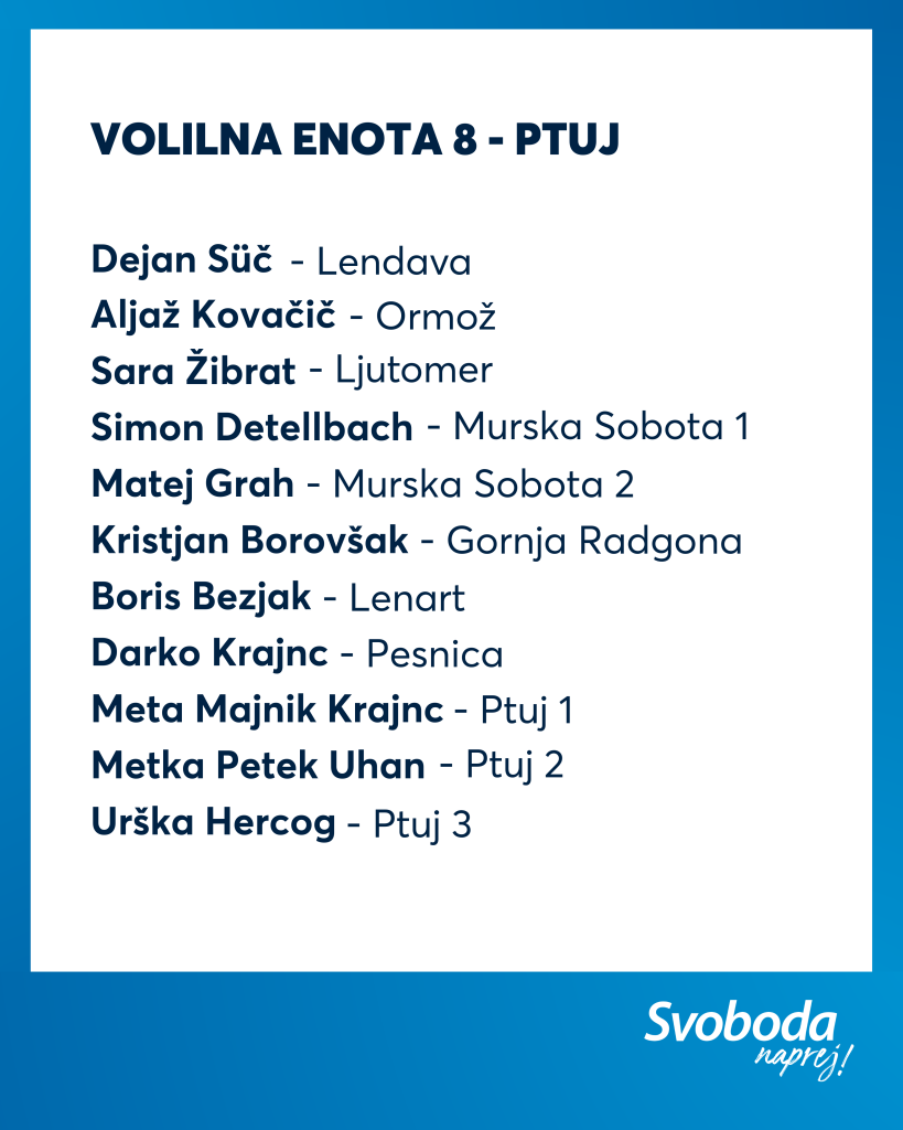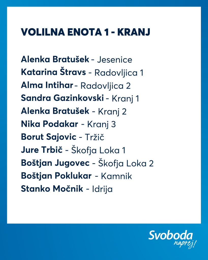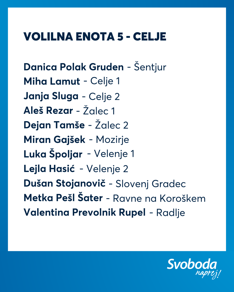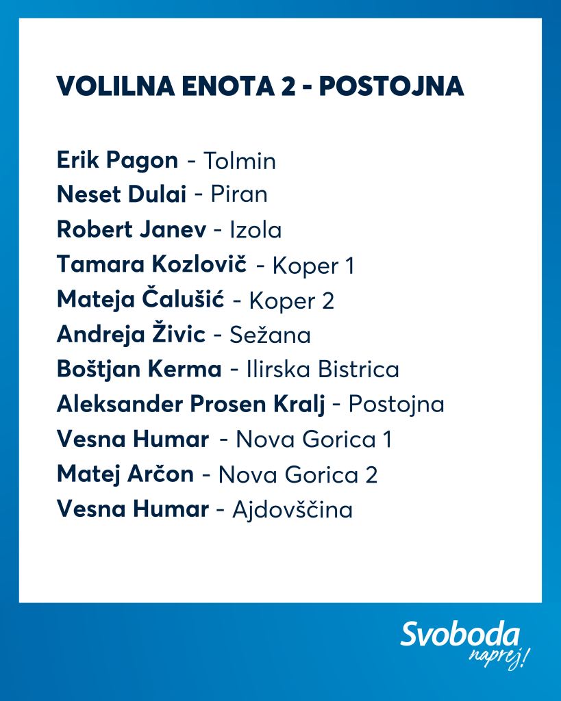 Ekipa Svobode je izkušena, na njej najdemo večino naših aktualnih ministrov ter poslank in poslancev, hkrati pa je kar 11 % kandidatk in kandidatov na naši listi mlajših od 35 let. Tako lahko zagotovimo kontinuiteto, stabilnost in odgovorno vodenje, hkrati pa tudi sveže ideje, ki jih Slovenija potrebuje.